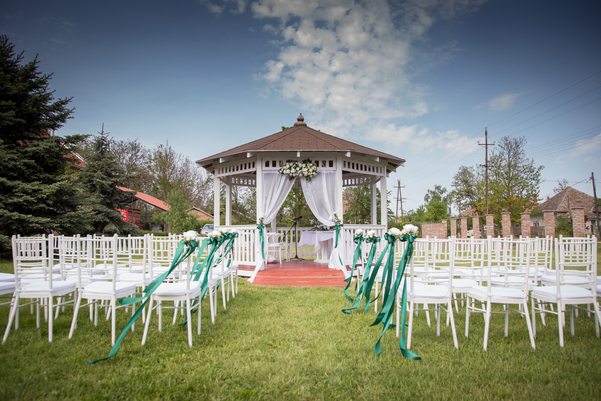 Polgári esküvői szertartás lebonyolítása lehetséges a rendezvényház parkjában.